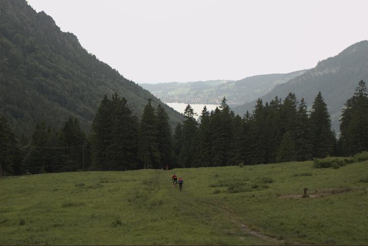 ... auf der Wiese liegt der Weg dann relativ genau auf der Bahntrasse (= Bildmitte) Durch die Schneise rechts führte von 1949 bis 1963 eine Kleinkabinenseilbahn von Josefstal herauf zum Spitzingsattel.