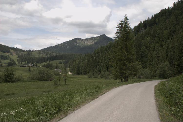 Kurz darauf umfährt die Bahntrasse die Senke der Valeppalm in einem weit ausholenden Haken. Zuerst ein Fahrweg, später ein breiter Wanderweg.